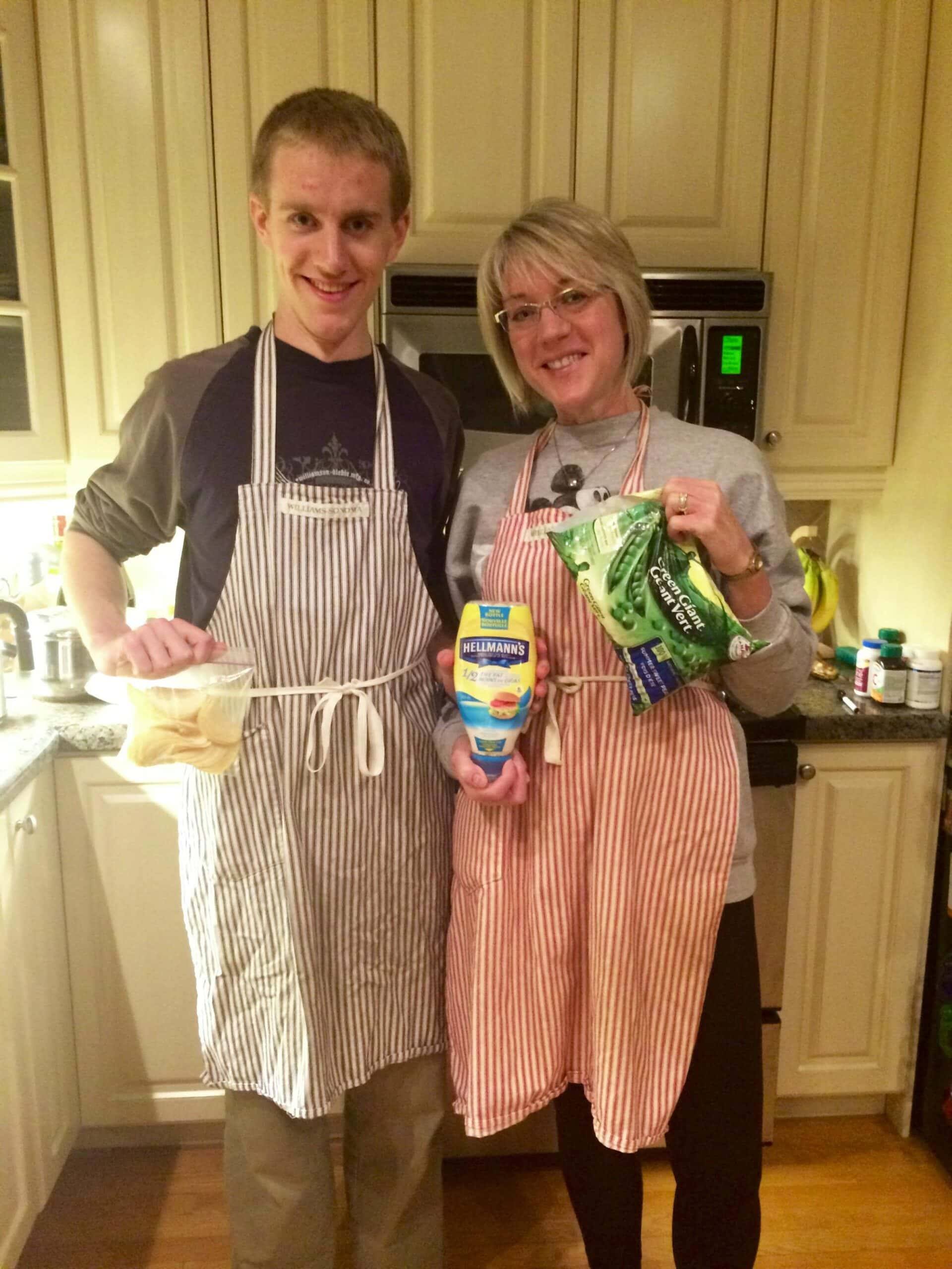 “As I sat there eating my nacho chips, I watched you cutting up the ham for the casserole. And I thought, “I bet she wishes she was sitting here eating nachos and not cutting up ham. I bet she doesn’t really want to be doing that at all…”” And then he abandoned his nachos, stood up and walked around the kitchen island.”Can I do anything to help? Because one of my New Year’s resolutions is to think about things from your perspective.”I blinked. We have been working on perspective-taking for fourteen years, and although I have seen glimmers of it in the past couple of years, never anything approaching this. Imagine, a self-initiated resolution to step into his mother’s shoes… from an 18-year-old boy… with autism. I blinked again.”I would love some help, Erik.” And then, “Do you know that your resolution has made my day? My year? According to the textbooks, you’re not supposed to be able to do this – to see things from my perspective. To empathize. But you do, you can… you want to… All amazing.” And I hug him. He looks proud, but also practical.”What can I do?” So I get him an apron and we chop, reading the recipe together, sipping white wine. He is 18 after all. The vibe is relaxed, connected. Proud.Heather comes in for a snack, and I excitedly tell her the news. “Erik has stepped into my shoes!” I relay her brother’s New Years resolution. Her face softens. She looks at him, and like her mother, she finds herself in his arms, hugging him. For all of her frustrations with her brother, he is the sweetest, most authentic person she knows. “Erik, you’ve just made my day,” she says. There is emotion in her voice. He smiles. He has heard this twice within ten minutes. It’s not that hard to please a woman after all.We continue to chop, fry, sauté and blend. He crushes potatoes chips for the casserole topping. He looks at me, brightly, pleased with himself and says, “Besides the extra hands, it’s more fun with me here, isn’t it?” I agree that it is. The people factor is also something we’ve talked about for years. It is a social world… most activities are better with people. He is serving my lines back to me, and I smile, but I do agree. Our casserole project has been fun. A combined effort is always better than a solitary march.This has been another Erik life lesson. Just when you think Erik isn’t with you, he most certainly is. He has a way of turning things right around. As I garnish the casseroles with paprika, I glance at him, hovering, watchful. Erik is a pretty interesting study into what’s possible in life. He has the right attitude, a growth mindset and a sparkling positivity that is rare with autism – rare, period. All pretty neat. We’ve most certainly gone from frustration to fascination. We pop the casseroles in the oven. I tell him, “That’s it… Thank you… and you can take your apron off now.” He doesn’t seem to want to. He looks over at me, and with big Erik eyes feeds me another Hedley stock phrase, a sage quote we’ve used for years with the kids, and it fits beautifully:”It’s never about the place… it’s always about the people.”Bravo, Erik! This is the year I will also try to step into your shoes…