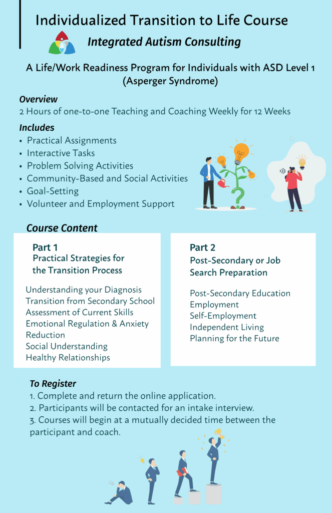 Transition from secondary school to life is one of the most stressful times in the lives of young adults, but for individuals with Autism Spectrum Disorders (Asperger Syndrome/ASD Level 1), the event is overwhelming and anxiety provoking. Since many lack the skills and confidence to enter into post-secondary education or the workplace they often graduate from the school system to their parents’ basements. The intent of this program is to respond to the increasing needs of young adults with ASD who require specific preparation programs and direct support to ensure a successful transition experience to the world of enhanced education, employment and independence. This 12 week program offers direct teaching and individual coaching, group interactive learning/social experiences and provides a significant focus on job search preparation, getting hired and keeping a job.